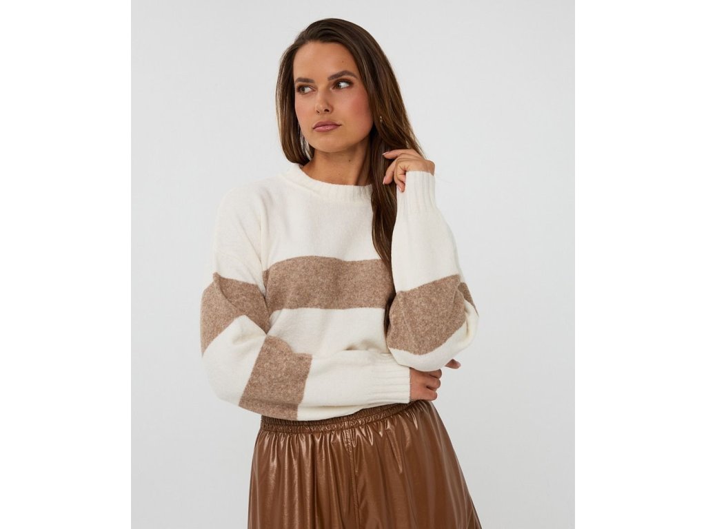 Tenhle svetr je přesně ten kousek, který ti zachrání ráno – oblečeš ho a okamžitě vypadáš chic. Neutrální pruhy v béžové a krémové barvě se hodí ke všemu a nikdy nevyjdou z módy.
